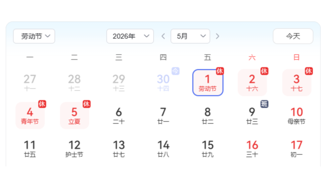 根据《国务院办公厅关于2026年节假日放假安排的通知》,并结合我司实际情况,本公司五一放假时间及相关事项安排如下: